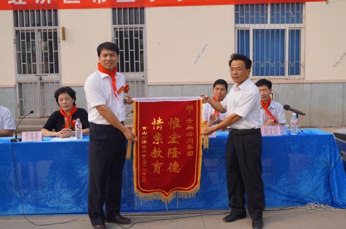 9月20日下午,秋高氣爽、陽光明媚,膠南市黃山經(jīng)濟區(qū)希望小學落成儀式在學校大操場隆重舉行。激昂的國歌聲后,少先隊員們?yōu)槌鱿I(lǐng)導敬獻紅領(lǐng)巾,以此來表達孩子們的崇高敬意。一位學生代表用稚嫩的童音道出了對青島海川建設(shè)集團及支持希望工程事業(yè)建設(shè)的各類愛心團體的誠摯感謝,和臺下上千名含苞待放,映襯在陽光里的一張張幸福笑臉一樣,他們都是祖國的未來和希望,也讓在場的每一位成年人對“捐資助教、功德無量”這句話有了更深刻的理解和感悟。黃山經(jīng)濟區(qū)希望小學校長懷著激動地心情向海川集團贈送錦旗一面,愛心助學的善舉也贏得了在場師生一次又一次熱烈的掌聲。集團黃中坡副總裁代表發(fā)言,他特別指出,今年恰逢集團成立60周年之際,本著“節(jié)儉辦大慶”和“注重社會公益性”的宗旨,集團將主要活動資金拿出來援建黃山經(jīng)濟區(qū)中心小學,另外發(fā)動企業(yè)職工向老一輩建筑人曾經(jīng)援建過的四川藏族甘孜地區(qū)捐獻衣物。通過一系列與社會接軌的主題活動,力爭將本次大慶辦得更有意義。最后他衷心希望膠南市黃山經(jīng)濟區(qū)中心小學的全體同學從小樹立遠大目標,刻苦學習,努力向上,爭做國家棟梁之才,立志回饋社會,報效祖國。青島團市委副書記張海軍和膠南市委副書記佟海燕也出席儀式并與海川集團黃中坡副總裁一起為希望小學揭牌,同時就海川集團對教育公益事業(yè)的傾情參與和大力支持給予了充分肯定和高度評價。