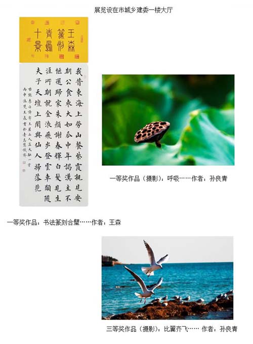 海川集團(tuán)員工在海川書畫攝影研究會(huì)的牽頭下積極參與此次展覽,創(chuàng)作精力充沛,在短短一周內(nèi)創(chuàng)作作品數(shù)十幅。展覽期間,主辦單位共收到各類參展作品294幅,其中:書法類作品83幅,繪畫類作品65幅,攝影類作品139幅,手工才藝類作品7件。在此次展覽中海川集團(tuán)員工周天馬、丁磊、孫良青、楊興強(qiáng)、寧楊、王森的作品入展并在市城鄉(xiāng)建委一樓大廳展出。這些作品主題鮮明、風(fēng)格多樣。在展覽后評(píng)獎(jiǎng)中,孫良青攝影作品《呼吸》獲攝影作品一等獎(jiǎng),《比翼齊飛》獲三等獎(jiǎng);王森《書法篆刻合璧》獲書法類一等獎(jiǎng)。