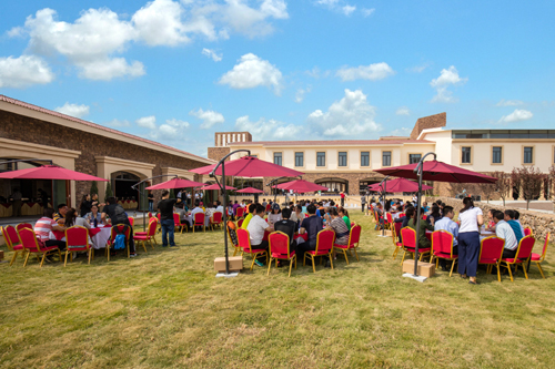 豐收節(jié)當天,與會嘉賓首先參觀了葡萄園。九頂莊園葡萄園現(xiàn)有種植面積90公頃,分片植有赤霞珠、霞多麗、味而多、梅鹿輒、品麗珠、蛇龍珠、西拉等多種葡萄。所有葡萄藤均由法國進口,以確保獲得最為優(yōu)質的克隆種與單一種。九頂莊園同時建有兩個溫室苗圃,用以培育嫁接植株,擴大葡萄園。
