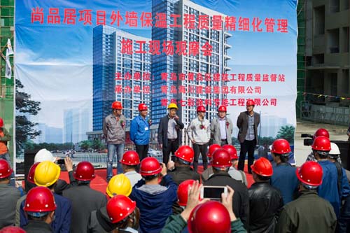 觀摩會當(dāng)天,集團副總裁馬志驍、七分公司總經(jīng)理朱超等陪同黃島區(qū)質(zhì)監(jiān)站領(lǐng)導(dǎo)進行了現(xiàn)場觀摩,上午9:00黃島區(qū)質(zhì)監(jiān)站領(lǐng)導(dǎo)主持了現(xiàn)場觀摩會,對照實體樣板詳細講解保溫工程各工序質(zhì)量保證要點。主要就工程實體保溫工程界面劑噴涂、玻纖網(wǎng)粘貼、加強層粘貼、窗洞口巖棉套割、錨栓固定等施工工藝進行了講解并宣布現(xiàn)場觀摩開始。黃島區(qū)各與會單位人員現(xiàn)場觀摩了實體工序樣板,各單位間相互切磋工藝做法,交流標(biāo)準(zhǔn)化管理經(jīng)驗。上午11:00觀摩人員陸續(xù)離開施工現(xiàn)場,現(xiàn)場觀摩會圓滿結(jié)束。
