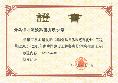 由海川集團(tuán)承建的2014青島世界園藝博覽會工程榮獲2014-2015年度中國建設(shè)工程魯班獎(國家優(yōu)質(zhì)工程)。表彰大會于2015年11月16日在北京釣魚臺國賓館舉行,海川建設(shè)集團(tuán)有限公司四分公司主任工程師張棟參加了會議,并捧回中國建設(shè)工程魯班獎(國家優(yōu)質(zhì)工程)獎牌及證書。