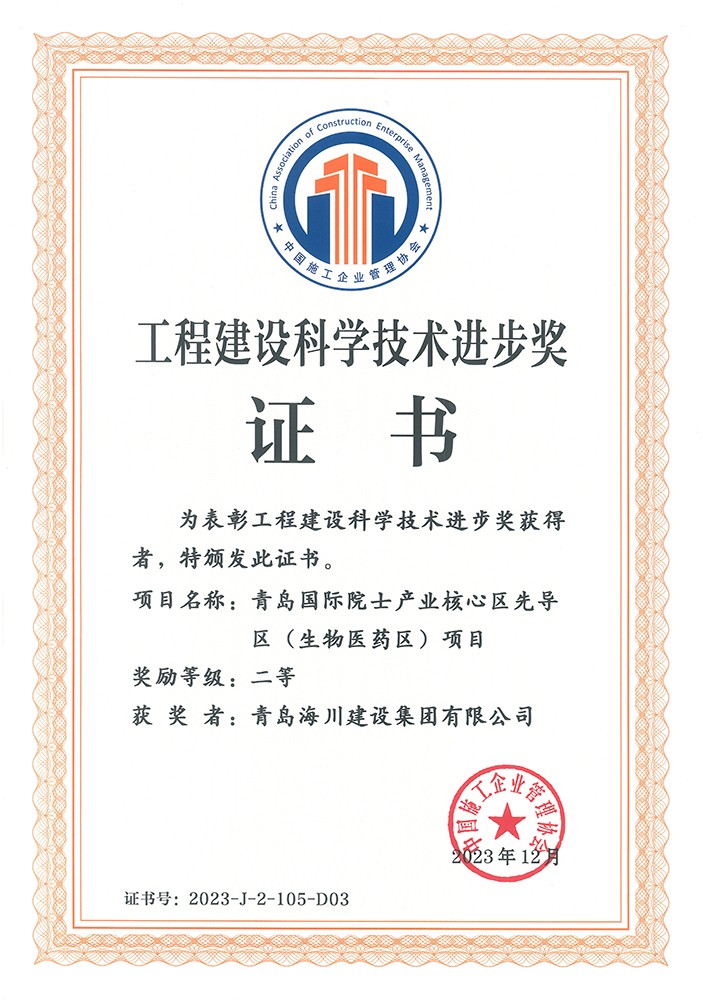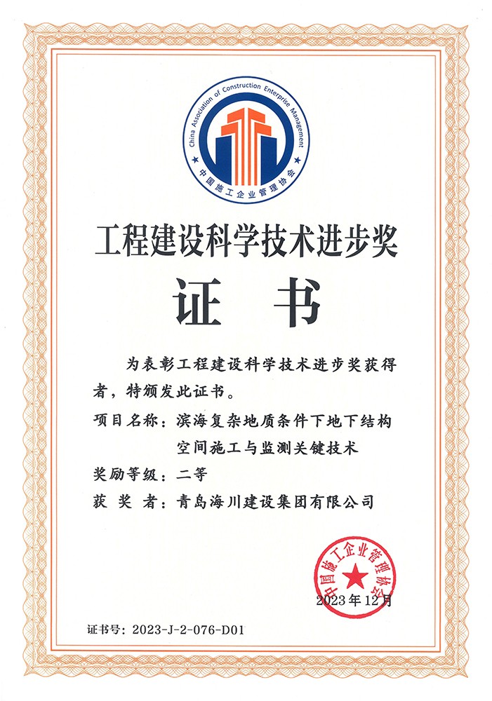 近日,集團公司從中國施工企業(yè)管理協(xié)會領回了2023年工程建設科學技術獎成果證書兩項,根據(jù)《工程建設科學技術獎評選辦法(2021年修訂稿)》的規(guī)定,經(jīng)科委辦公室形審、專家網(wǎng)評、科委專家委員會評審、科學技術委員會審定和公示,以及會長會議批準,由海川建設主持的課題《濱海復雜地質(zhì)條件下地下結(jié)構空間施工與監(jiān)測關鍵技術》以及聯(lián)合申報課題《青島國際院士產(chǎn)業(yè)核心區(qū)先導區(qū)(生物醫(yī)藥區(qū))項目》均獲得了科技進步獎二等獎,本次獲獎,是企業(yè)首次以第一完成單位獲得的國家級社會力量科學技術獎,對于推動企業(yè)技術創(chuàng)新具有重大意義。